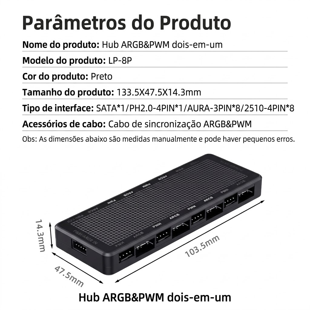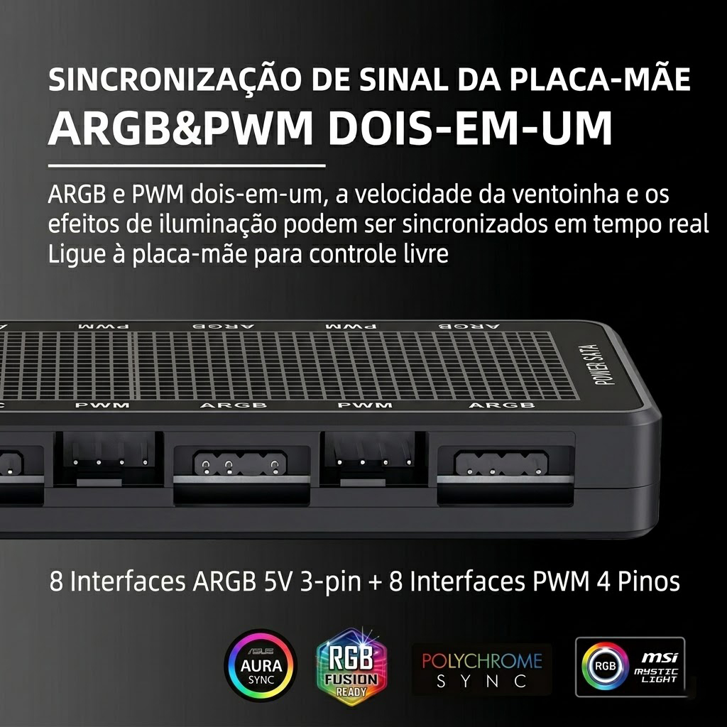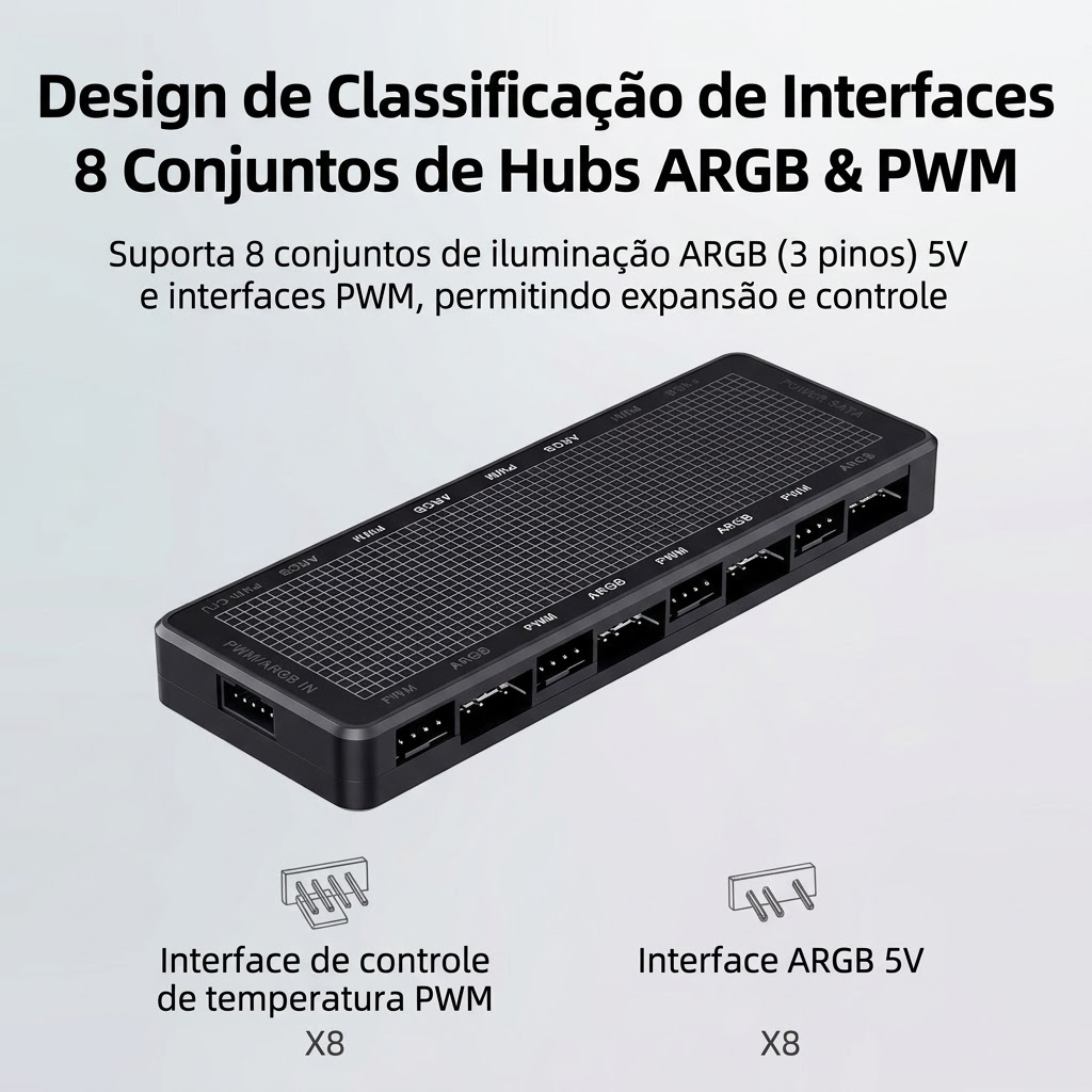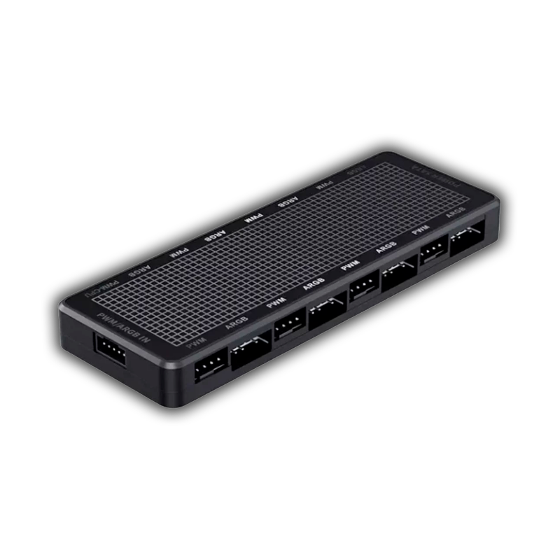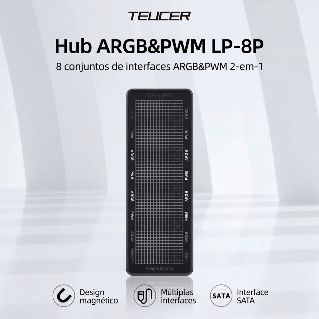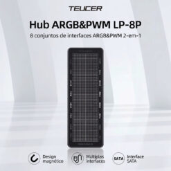 O TEUCER LP-8P é um hub controlador 2 em 1 desenvolvido para quem precisa expandir conexões de fans e iluminação ARGB no PC gamer. Ele permite conectar múltiplas ventoinhas e sincronizar tanto a velocidade (PWM) quanto os efeitos RGB (ARGB) diretamente pela placa-mãe, deixando o setup mais organizado e eficiente.