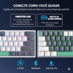 O Machenike K500-B61W é um teclado mecânico gamer compacto no formato 60%, projetado para quem busca desempenho, portabilidade e um setup mais minimalista. Ele conta com conectividade tri-mode, permitindo usar o teclado via Bluetooth, 2.4 GHz sem fio ou cabo USB-C, oferecendo flexibilidade para computadores, notebooks, tablets e até smartphones.