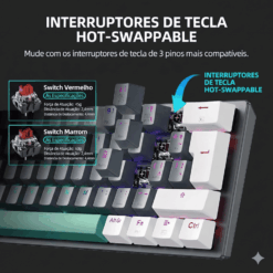 Equipado com switches mecânicos hot-swap, o teclado permite trocar facilmente os switches sem solda, possibilitando personalização conforme a preferência do usuário. Sua iluminação RGB com até 16,8 milhões de cores e diversos efeitos deixa o setup mais estiloso e personalizável.